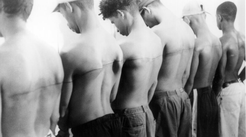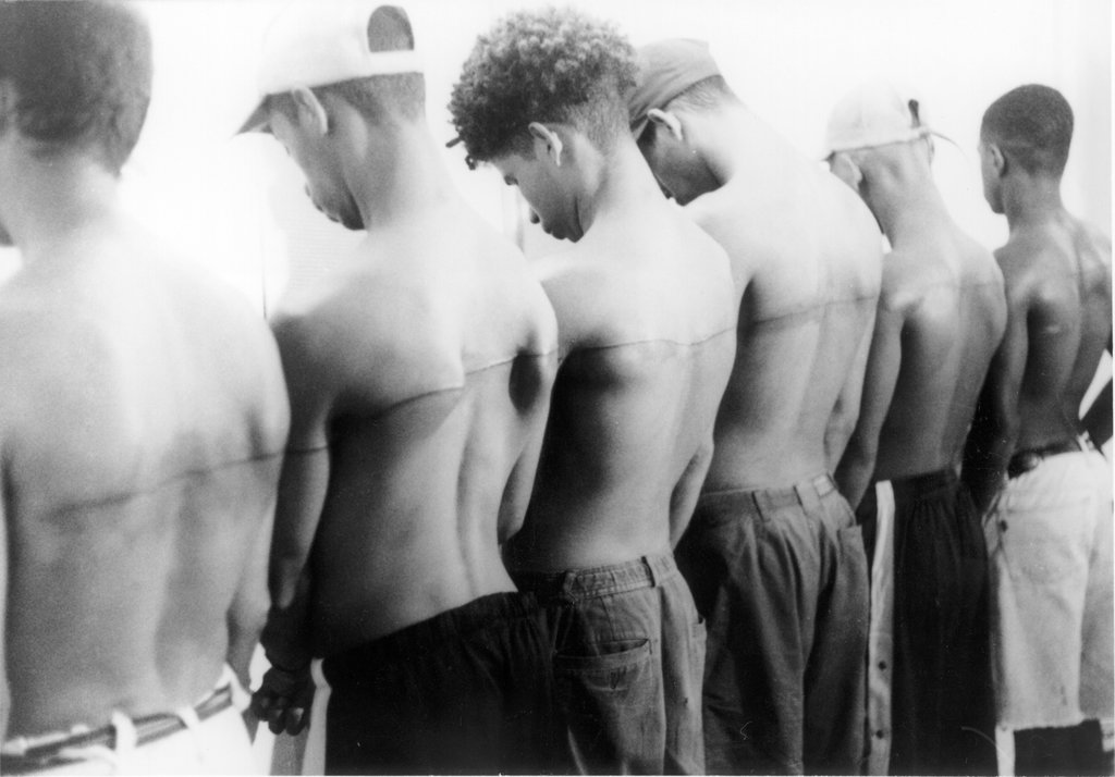 시에라를 세계적인 반열에 올린 동시에 가장 큰 비난의 화살을 받게 한 작품은 ‘헤로인 중독자 6명의 등 위에 문신한 160cm의 선(160cm Line Tattooed on 6 Paid People)’입니다. 그는 직업 없이 거리를 떠도는 청년 여섯 명을 1인당 30달러 정도에 고용했습니다. 작가는 그들을 일렬로 세워두고 등을 가로지르는 일직선 문신을 했죠. 그는 이후로도 세계 곳곳에서 문신을 한 적이 없고 할 생각도 없었지만, ‘돈을 받는다면 몸에 영원히 남을 문신을 하는 데 동의할 사람들’을 찾아 일직선을 새겼습니다.