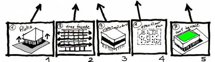 - 자유로운 입면(Free Facade) — 외벽을 구조에서 분리해 자유로운 조형 가능.