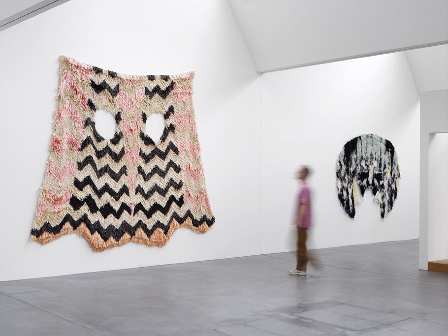 프랑스-영국 작가 캐롤라인 아샹트르(Caroline Achaintre)는 캔버스에 양모를 펀칭하는 노동집약적인 공정인 터프팅(tufting)을 통해 프리미티비스트(Primitivism) 직물 벽 작품을 제작합니다. 그 결과, 사람과 동물의 모호한 묘사가 담긴 두꺼운 질감의 가면 태피스트리가 탄생합니다. 회화와 조각, 공예의 경계를 허무는 이 설치물들은 유머와 공포를 동시에 불러일으킵니다.